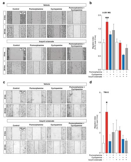 U-251 MG and T98-G cells were seeded in 24-well plates at a final concentration of 3 × 105/well and grown until cells reached about 90% confluency. The day after a central and linear scratch was created using a 200 μL tips and samples were washed with PBS to remove residuals cells; media were then replaced with migration medium (DMEM high glucose, 100 IU/mL Penicillin-Streptomycin and 2 mmol/L glutamine) containing vehicle, 1 µM purmorphamine and/or 1 µM cyclopamine added alone or in combination with ioxynil octanoate at a final concentration of 10 µM. For the quantification of migration index, the total scratch area was segmented from one edge to the opposite edge and the total size of the wound was then measured at 0 and 24 h post scratch and migration index was calculated as percentage ratio of scratch area at 0 h -scratch area at 24 h over scratch area at 0 hrs. All values are shown as the mean FC over 0 hrs ± SEM.
