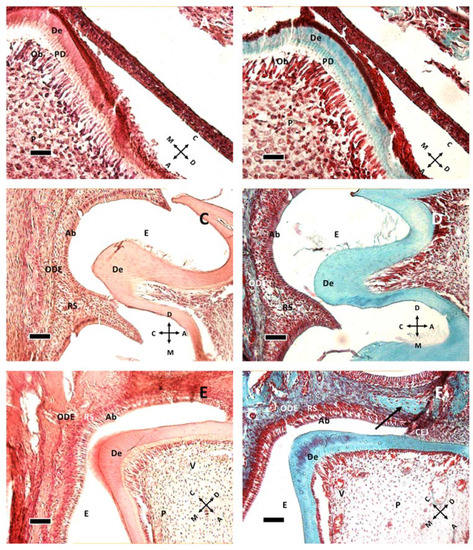 Dentin formation at P1 (A,B), P8 (C,D) and P11 (E,F). The image presents a comparison of dentin in hematoxylin and eosin staining (A,C,E) and Gomori trichrome staining (B,D,F). (A,B) at P1, the odontoblastic layer, actively forming pre-dentin (PD) and dentin (De), is present. Beneath them, pulp cells (P) can be seen. (C,D) at P8 the stellate reticulum (RS) lies between ameloblasts (Ab) and the outer dental epithelium (ODE). Enamel (E) cannot be seen due to decalcification procedure prior to staining. (E,F): At P11, some vessels (V) can be seen in the pulp tissue, and the cementoenamel junction (CEJ) is apparent. The arrow in (F) shows a different organization of connective tissue, possibly indicating the difference between dental sac and bone tissue. (A,B): 40× objective bar = 25 μm. (C–F) 20× objective, bar = 50 μm. Orientation is given by arrows: coronal (C), apical (A), mesial (M) and distal (D), odontoblasts (Ob).