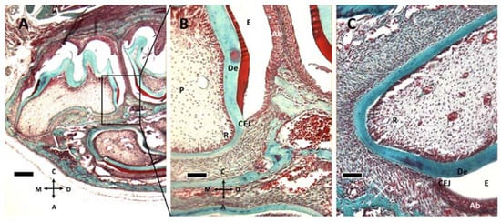 Gomori trichrome staining of M1 at P8 (A,B) and P11 (C). (A) M1 and M2 teeth are apparent at P8. (B) the box in (A) is captured at higher magnification. Enamel (E), ameloblasts (Ab), cementoenamel junction (CEJ) and dentin (De) can be recognized, together with the elongating root (R) and tooth pulp (P). (C) At P11, the root tissue appears more structured and well vascularized. (A) 5× objective, bar: 200 μm. (B,C) 20× objective, 50 μm. Orientation is given by arrows: coronal (C), apical (A), mesial (M) and distal (D).