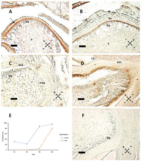 Nestin expression at P1 (A), P5 (B), P8 (C), P11 (D). (A) The arrow indicates nestin immunolabeling at P1: The signal is higher in the apical region of odontoblasts (Ob) above pulp (P). (B) The same pattern of expression is apparent at P5. (C,D) Root elongation at P8 (C) and P11; (D) mature Ob in contact with Hertwig’s epithelial sheath (HES). Note the difference in apical region between preodontoblasts (POb), elongated unlabeled cells and subsequent mature Ob in (D). CEJ: cementoenamel junction. (E) Percentage of labeled area in the odontoblast layer of the crown and root region at different ages. (F) Negative control, without the primary antibody, P8 sample. 40× objective, bar = 25 μm. Orientation is given by arrows: coronal (C), apical (A), mesial (M) and distal (D), dentin (De).
