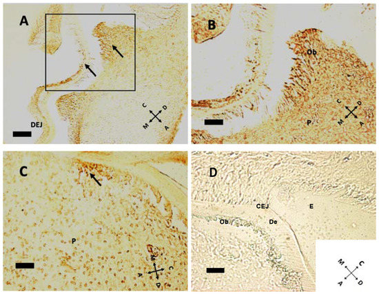 Cell proliferation indicated by Ki-67 immunoreactivity at P1 (A,B), P8 (C). (A) At P1, some cellular divisions can be seen at cusp peaks. Arrows indicate proliferating cells (n = 14 and 39, respectively) in both epithelial and mesenchymal tissues. Note the dentin–enamel junction (DEJ). (B) Higher magnification of the boxed area in (A) Some possibly ultimate cell divisions can be seen in the odontoblast layer, above pulp (P). (C) Ki-67-positive cells are all under the cementoenamel junction at P8 (arrow in (C)), at a density of 288.25 labeled cells/mm2. (D) Negative control, without primary antibody, P11 sample. E: enamel; De: dentin; CEJ: cementoenamel junction. (A) 20× objective, bar = 50 μm; (B–D): 40× objective, bar = 25 μm. Orientation is given by arrows: coronal (C), apical (A), mesial (M) and distal (D), odontoblasts (Ob).