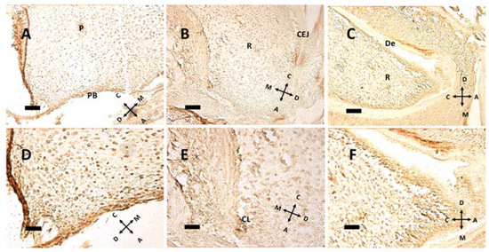 Immunohistochemical detection of the nuclear antigen Ki-67 at P5 (A,D), P8 (B,E) and P11 (C,F). The same fields, captured at lower (A–C) or higher (D–F) magnification, are presented. Note the relationship between cell proliferation and root elongation. (A,D) Some proliferating nuclei can be seen in pulp (P) and the pulpal bottom (PB) at P5, with 263.48 labeled cells/mm2. (B,E) The cervical loop (CL), which guides root (R) elongation, is present, with 226.03 labeled cells/mm2. CEJ: cementoenamel junction. (C,F) While at P8 dentin (De) is not fully formed, it is present as a major deposition at P11, with 382.51 labeled cells/mm2. (A–C) 20× objective, bar = 50 μm. (D–F) 40× objective, bar = 25 μm. Orientation is given by arrows: coronal (C), apical (A), mesial (M) and distal (D).