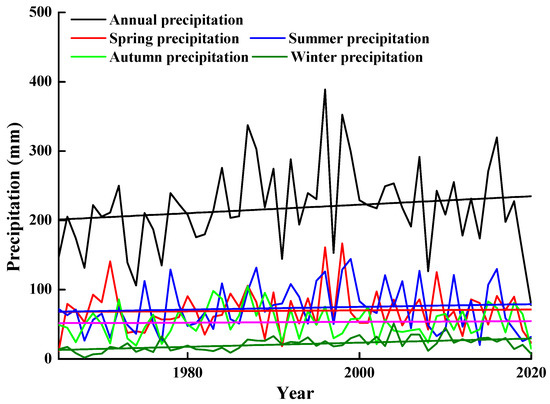 Precipitation at the Fukang weather station in spring, summer, autumn, and winter, 1965–2020.