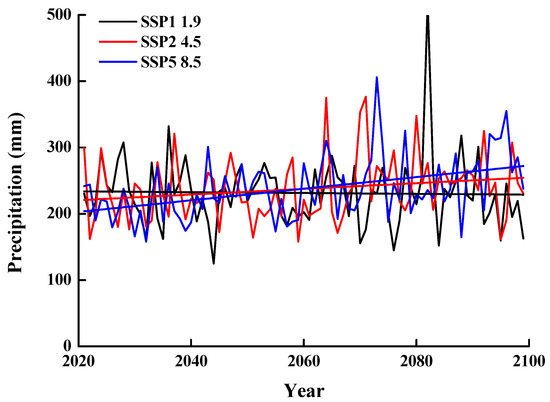 Projected annual precipitation in SSP1 1.9, SSP2 4.5, and SSP5 8.5 scenarios from 2021 to 2099, using data from the Fukang weather station.