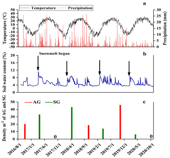 Average daily soil temperature and daily precipitation at the study site from 1 September 2016 to 1 November 2020 are shown in Figure 4a. The temperature reached a minimum of −33.8 °C on 27 January 2018 and a maximum of 39.2 °C on 11 July 2019. From September to November 2016, 2018, and 2019, there were 4, 3, and 5 precipitation events of >5 mm, respectively, which provided favorable soil moisture for the emergence and growth of AG plants (Figure 4b). However, from September to November 2017 and 2020 there were only one and no precipitation events of >5 mm, respectively. Amount of precipitation in spring 2017 (89.3 mm) and 2018 (84.1 mm) was significantly higher than that in spring 2019 (35.7 mm) and 2020 (23.1 mm) (Figure 4a). Snow depth in winter 2016, 2017, 2018, and 2019 was 36.7, 28.7, 27.7, and 33.0 cm, respectively. Water from melting snow in early spring and precipitation in the late spring and summer was relatively abundant in 2017 and 2018. Thus, autumns of 2016, 2018 and 2019 were defined as wet and autumns of 2017 and 2020 as dry, springs of 2017 and 2018 as wet, and springs of 2019 and 2020 as dry.