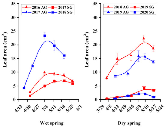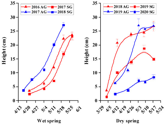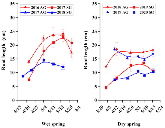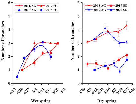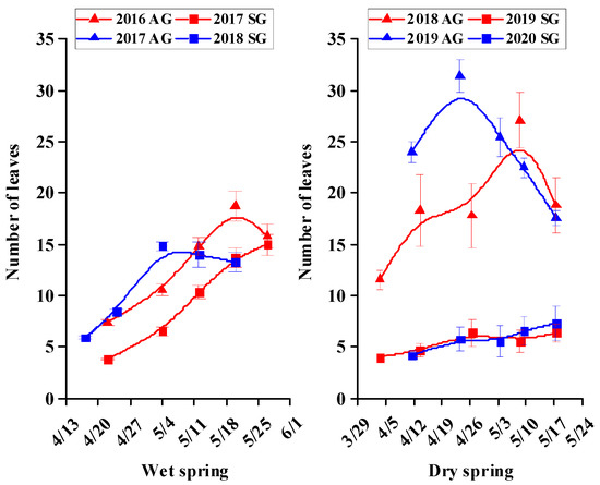 For SG and AG plants in wet springs and for AG plants in dry springs, growth was rapid during the vegetative stage, but then it tended to plateau or decrease during the reproductive stage; For SG plants in dry springs, growth was very slow during the vegetative and reproductive stages (Figure 5, Figure 6, Figure 7, Figure 8 and Figure 9). In dry springs, all morphological characters of AG plants were larger in size/higher in number than those of SG plants. In wet springs (2017 and 2018), the root length of SG plants did not differ significantly from that of SG plants in dry springs (2019 and 2020), while root length of SG and AG plants in 2017 was significantly higher than that of SG plants in 2018 (Figure 6). Conversely, the leaf area of SG plants in wet springs was significantly greater than that of SG plants in dry springs, while the initial leaf area, number of leaves, and number of branches of AG plants in dry springs were higher than for SG and AG plants in wet springs (Figure 7, Figure 8 and Figure 9).