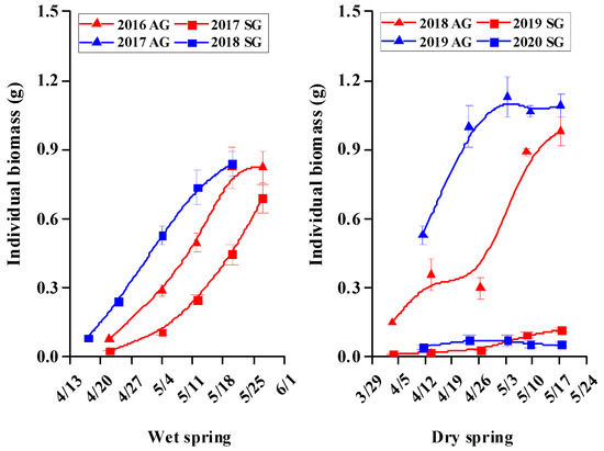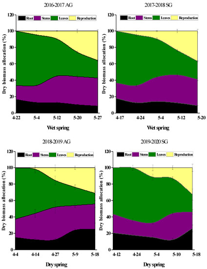 During the vegetative stage, roots, stems, and leaves of both SG and AG plants in dry and wet springs accounted for all biomass allocation, and allocation of biomass to leaves was greater than that to roots and stems (Figure 11). As plants matured, allocation of biomass to leaves and roots decreased gradually, allocation to stems increased gradually, and allocation to reproductive parts began (Figure 11). In the late growth stage in wet springs, biomass allocation to leaves of both SG and AG plants began to decrease rapidly, and that to reproductive organs began to increase rapidly. During the reproductive stage, allocation of biomass to stems and reproductive organs was higher than that to roots and leaves. In dry springs, biomass allocation in SG plants differed from that in SG plants in wet springs. In the late growth stage, allocation of biomass to leaves and roots was higher than that to stems and reproductive organs (Figure 11).