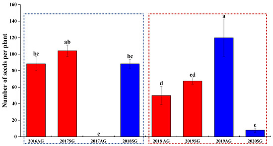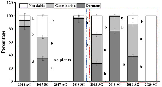 The number of seeds produced was higher for both SG and AG plants in wet springs than in dry springs, except for AG plants in the dry spring of 2019 (Figure 12). The percentage of germinated, dormant, and nonviable seeds differed between SG and AG plants in both wet and dry springs. A higher proportion of dormant seeds of AG plants was produced in wet than in dry springs, while proportion of dormant seeds of SG plants produced in wet vs. dry springs did not differ significantly (Figure 13). The percentage of nonviable F2 seeds produced by SG plants in wet springs was 32.0 (2017) and 2.0 (2018) and in dry springs 1.0 (2019) and 100 (2020). The percentage of nonviable F2 seeds produced by AG plants in wet springs was 7.0 (2016) and in dry spring 28.0 (2018) and 12.7 (2019). Dormancy of F2 seeds produced by SG plants in the wet springs was 35.0% (2017) and 96.0% (2018) and in dry springs was 77.0% (2019) and 0% (2020). However, the dormancy of F2 seeds produced by AG plants in wet springs was 84.0% (2016) and 27.0% (2018) and in the dry spring 37.6% (2019). Germination of F2 seeds produced by SG plants in wet springs was 33.0% (2017) and 2.0% (2018) and in dry springs was 22% (2019) and 0% (2020). However, germination of F2 seeds produced by AG plants in wet springs was 9.0% (2016) and 45.0% (2018) and in the dry springs was 49.7% (2019) (Figure 13).