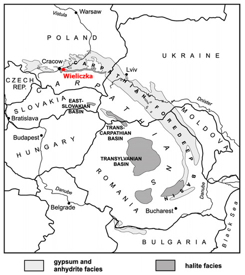 Location of Miocene evaporite deposits in the Carpathian Foredeep (adapted from Babel [27]).