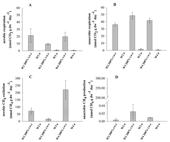 Microbial activity ((A)—aerobic respiration; (B)—anaerobic respiration; (C)—aerobic CH4 oxidation; (D)—anaerobic CH4 production) in marine sediments under different moisture (natural—n and saturated—200% t.w.c.) and aeration conditions at 20 °C (error bars represent standard deviation, n = 3).