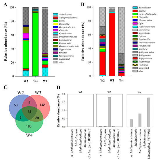 In general, the investigated samples were dominated by Bacteria (26–97%) and unclassified microorganisms (3–64%). In the W3 and W4 samples, aside from the Bacteria domain, Archaea (to 0.5%) were also observed. Taxonomic analysis of NGS results indicated dominance by the phylum Firmicutes (50–92%) in the W2 and W3 samples, whereas W4 was dominated by unclassified microorganisms (64%). Proteobacteria and Actinobacteria were also found in large numbers (10–14% and 8–10% respectively) in W2 and W4. Analysis of deeper taxonomic levels revealed 14 different bacterial classes present in the Wieliczka Formation sediments (Figure 3A). Figure 3A presents the top 10 classes for each sample, while other classifications were grouped in the “other” category. The most abundant class in the W2 and W3 samples was Bacilli (40 and 91%), while in the W4 sample it made up only ca. 6%. Apart from the unclassified microorganisms (64%), the W4 community comprised a substantial proportion of Actinobacteria (13%). In W3, Bacilli were accompanied by Sphingobacteriia (3%) and Gammaproteobacteria (2%), whereas in W2, Clostridia, Gammaproteobacteria and Actinobacteria were at a similar level (8–9%).