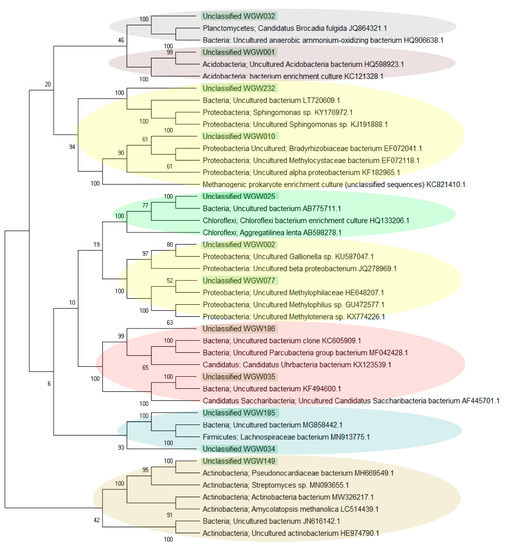 Among the 443 ASV detected in the studied saline sediments, as many as 317 were assigned as unclassified. The sequences constituting > 1% were analysed separately using BLASTN (NCBI). Unclassified_WGW032, WGW001, WGW025 and WGW149 formed separate taxa and were not related to each other or to the other analysed unclassified sequences, they occurred mainly in samples W2 and W4 but also in W3 (Unclassified_WGW001). The remaining sequences were grouped into 4 clades. The sequence Unclassified_WGW232, which was identified in the W2 sample, was similar to Unclassified_WGW010 found in W4. Unclassified_WGW186 (found in W2) and Unclassified_WGW035 (found in W2 and W4) were grouped into the second clade. It was also shown that two other unclassified sequences (Unclassified_WGW002 and WGW077) present in W3 and W4 samples were similar to each other. In the last clade, the sequences Unclassified_WGW185 and WGW034 identified in W2 were grouped (Figure 4 and Figure 5). Evolutionary relationships with high bootstrap value indicate a potential affiliation of unclassified sequences to selected taxa at the phylum level, i.e., Planctomycetes (Unclassified_WGW032), Acidobacteria (Unclassified_WGW001), Proteobacteria (Unclassified_WGW232, WGW010, WGW002 and WGW077), Chloroflexi (Unclassified_WGW025), Candidatus (Unclassified_WGW186 and WGW035), Firmicutes (Unclassified_WGW185 and WGW034) and Actinobacteria (Unclassified_WGW149) (Figure 4).