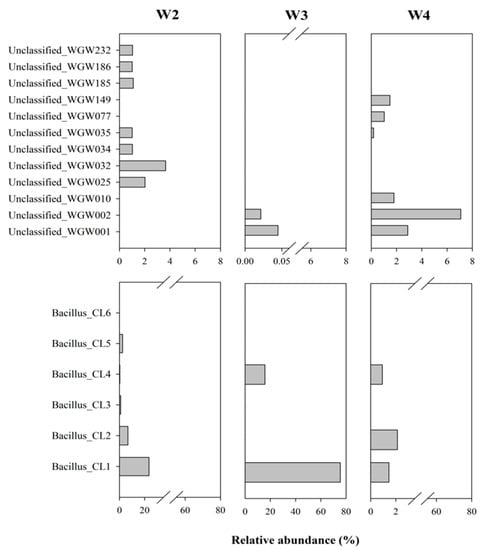 Similarly, due to their high percentage (up to 91% in W3), the sequences assigned to Bacillus were analysed separately. It was found that the sequences classified as Bacillus (21 different, unique sequences) were grouped into six clusters (designated as Bacillus_CL1-6). Figure 5 and Figure 6 present the percentage of the occurrence of individual clusters in the studied samples (sequences > 1%) and the phylogenetic tree of these clusters. Bacillus_CL1, CL5 and CL6 clusters were grouped into one clade, wherein Bacillus_CL1 and CL6 were most closely related to each other. However, Bacillus_CL3 and CL4 formed a second clade and CL2 are less related than the rest of the Bacillus sequences. (Figure 6). This unique Bacillus CL1 clade accounted for more than 23% and 75% of all sequences assigned to Bacillus in samples W2 and W3, respectively. In the W2 sample, in addition to CL1, the sequences assigned to CL2-CL5 (0.34–6.7%) were also found. In the W3 sample, Bacillus_CL4 (16%), CL2 (0.09%) and CL6 (0.02 %) also occurred. The smallest diversity among Bacillus sequences was demonstrated in sample W4 where clades Bacillus_CL1 CL2 and CL4 (1–2%) were present (Figure 5).