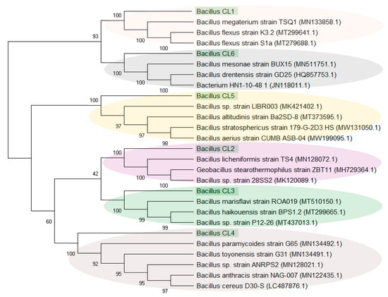 Evolutionary relationships of Bacillus clusters, where the numbers above the branches indicate the bootstrap value. Phylogenetic tree determined by the Neighbour-joining method using MEGA-X software. The clades are marked with colours.