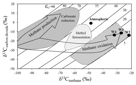 Methane oxidation and production pathway in the Wieliczka Formation sediments through stable δ13Cmethane versus δ13Ccarbon dioxide isotopes (adapted from Whiticar [45]).