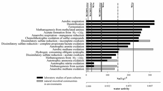 Approximate upper salt concentration limits for the occurrence of selected microbial processes. Dashed line represents 2.5 M NaCl cut-off for extreme halophiles (adapted from Oren [51,52]). Vertical lines represent NaCl concentration in natural moisture samples (W2n–W4n) and in 200% t.w.c. samples (W2200%t.w.c–W4200%t.w.c) (current study).