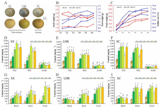 Changes in phenotypic traits and FAAs at six stages of fruit development of three longan varieties (S1–S6). (A) The mature fruits of three varieties with typical flavor. (B,C) Changes in main fruit characters. (D–F) Changes in amino acid composition in SX, LDB, and XC, respectively. (G–I) Changes in amino acids categorized with respect to taste in SX, LDB, and XC, respectively. TAC: total amino acid content, PAC: protein amino acids, AAM: amino acid metabolites; BAA: bitter amino acid, SAA: sweet amino acid, UAA: umami amino acid. Values represent the mean of three biological samples, and different uncapitalized letters indicate an extremely significant difference between the different stages (LSD test, p ≤ 0.01).