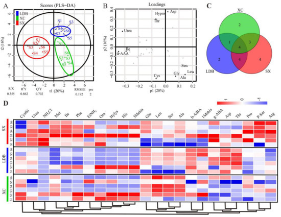 Multivariate analysis of FAAs identified in different longan cultivars during fruit development. (A) PLS-DA scores plot of FAAs profiles from SX, LDB, and XC fruits. (B) PLS-DA loadings plot for three cultivars. (C) Venn diagram of different significantly discriminant FAAs (content data were log-transformed and then normalized) from different stages. (D) Heatmap cluster showing the content of 23 FAAs in three longan cultivars.