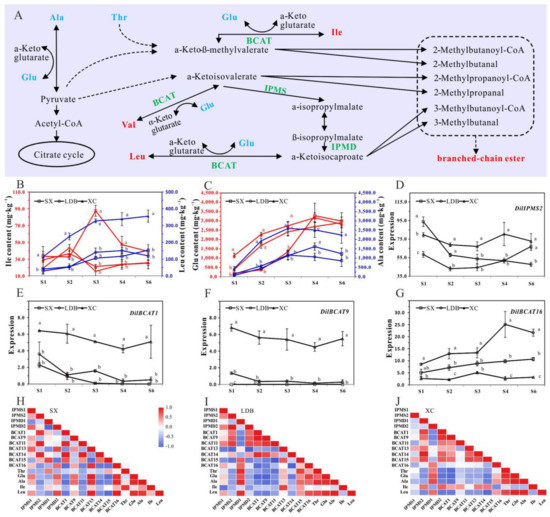 The BCAAs biosynthesis in longan fruit and expression patterns of genes encoding BCAAs biosynthesis and degradation during fruit development. (A) Pathway involved in BCCAs synthesis and degradation was adapted from Alsmairat et al. [14] and Wang et al. [31]. Dashed lines indicate multiple chemical reaction steps. (B,C) The main amino acids accumulated differently among varieties. (D–G) Transcription profiles of BCAAs biosynthesis-related genes in longan fruit. (H–J) Heatmap of Pearson’s correlation coefficient. Each data point represents the mean of three biological samples, and vertical bars represent ± standard error.