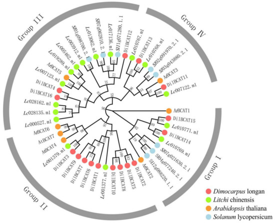 Based on the gene function annotation and protein blast, 20 putative genes related to the metabolism and synthesis of BCAAs were identified in three families of longan genome, including 2 DilIPMS, 2 DilIPMD, and 16 DilBCAT, which were unevenly distributed on chromosomes 1, 5, 6, 7, 8, 9, 11, and 14, encode 609–825, 408–418, and 111–412 amino acids, respectively (Table S2). In addition, 16 BCAT genes were also identified from litchi genome (Table S3). The phylogeny of the BCAT family was analyzed by combining the previous reports on Arabidopsis [25] and tomato [26]. The results showed that the BCAT gene family could be divided into four subgroups i.e., group I, II, III, and IV. The BCAT family in longan and litchi of Sapindaceae were both obviously expanded, and DilBCAT genes had multiple adjacent copies on chromosomes 5 and 11 (Figure 4, Table S2).