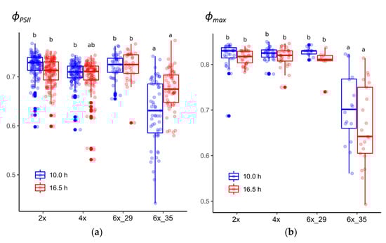 Likewise, the extended photoperiod did not affect the dark-adapted maximum quantum yield of PSII (ϕmax) with the only exception again being clone 6x_35 that differed significantly from the others (Figure 1b). Interestingly, after dark adaptation, 6x_35 plants that had been exposed to the extended photoperiod showed a lower median than in the case of ϕPSII, in which the median of the 10 h-exposed plants was lower.