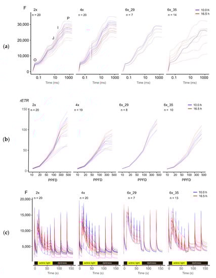 Albeit revealing no specific insights, Figure 2 points to the subtle differences between ploidies and photoperiods that merited further exploration. For example, (1) OJIP curves of the 6x_35 varied much more than the other cytotypes (Figure 2a); (2) the light curves of the tetraploids differed clearly from the other cytotypes (Figure 2b), and (3) different photoperiods tended to cause some differentiation in the polyploid Kautsky curves but not those of the diploid cytotypes (Figure 2c).