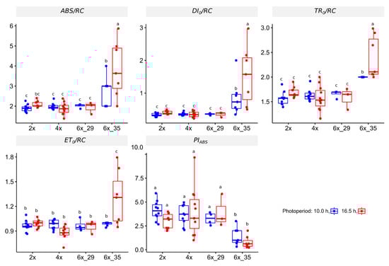 Coefficients calculated from fluorescent transient (OJIP) analysis of R. auricomus cytotypes exposed to two different photoperiods; absorption energy flux per PSII center (ABS/RC), dissipated energy fl. (DI0/RC); trapper energy fl. (TR0/RC); electron transport fl. (ET0/RC); performance index on absorption basis related to PSII activity (PIABS); for summary statistics, see Table S4, letters represent 95% Duncan. Boxplots show the 25th, median, and 75th percentile range, and jitter plots represent the exact data distribution.