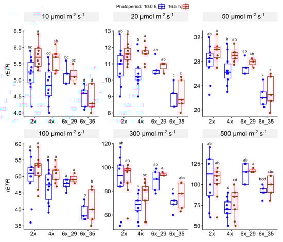 Relative electron transport rate (rETR) from light curve (LC) experiments of R. auricomus cytotypes exposed to two different photoperiods in increasing actinic light PPFD; for summary statistics, see Table S5, letters represent 95% Duncan. Boxplots show the 25th, median, and 75th percentile range, and jitter plots represent the exact data distribution.