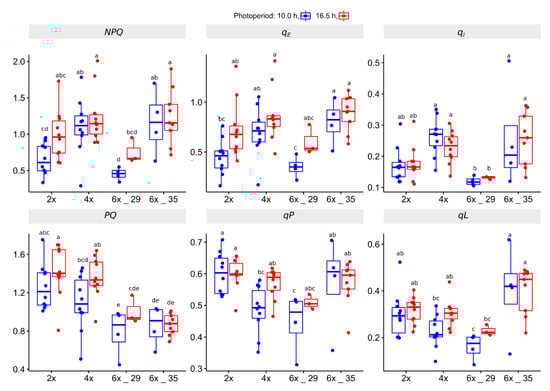 Coefficients calculated from Kautsky curve (KC) experiments of R. auricomus cytotypes exposed to two different photoperiods; non-photochemical quenching: NPQ, qE (heat dissipation NPQ), qI (photoinbitory NPQ); photochemical quenching: PQ, qP, qL (estimates of open non-reduced PSII centers). For summary statistics, see Table S6, letters represent 95% Duncan. Boxplots show the 25th, median, and 75th percentile range, and jitter plots represent the exact data distribution.