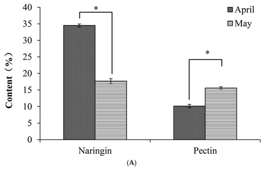 In order to determine which sample should be used for further analysis, the content (dry weight, DW) of naringin and pectin of IPF produced in April and May were quantified (Figure 2A). We found that the naringin content of IPF in April was dramatically higher than that of IPF in May, at 34.53 ± 0.74% and 17.67 ± 0.43%, respectively (p < 0.05). This is in agreement with previous research showing that flavonoid content is the highest during the immature period []. However, the pectin content was significantly lower in April than in May, (10.14 ± 0.36% vs. 15.60 ± 0.53%, p < 0.05). As the naringin content in April was twice as high as in May, we selected the IPF collected in April for the further study, even though the pectin content was slightly lower.