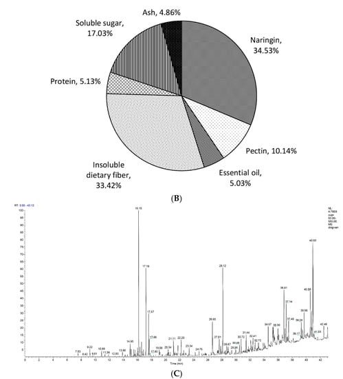 The essential oil content was determined by the Soxhlet extraction method []. The pectin content was determined using the phenol-Carbazole method with galacturonic acid as the standard []. The naringin content was quantified using high performance liquid chromatography (HPLC) [] with minor modifications. Specifically, samples were loaded onto a Shimadzu HPLC (15C) equipped with a PDA detector and separated using a mobile phase composed of (A) deionized water containing 0.2% phosphoric acid and (B) acetonitrile containing 0.2% phosphoric acid. Elution was carried out using a gradient of 25% B over 20 min at a flow rate of 1.0 mL/min at 25 °C. The HPLC system was equipped with a YMC-Pack Pro C18 column (4.6 mm × 250 mm, 5 μm) at 283 nm.