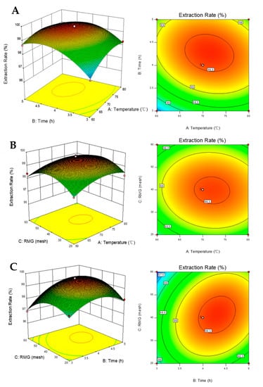 Three-dimensional response surface graphs and contour plots for the effects on naringin extraction rate under the following parameters: (A) temperature and time; (B) RMG and temperature; and (C) time and RGM.