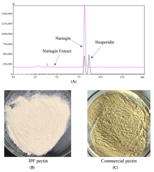 HPLC chromatogram of naringin extract (A); Freeze-dried IPF pectin (B) and purchased pectin (C).