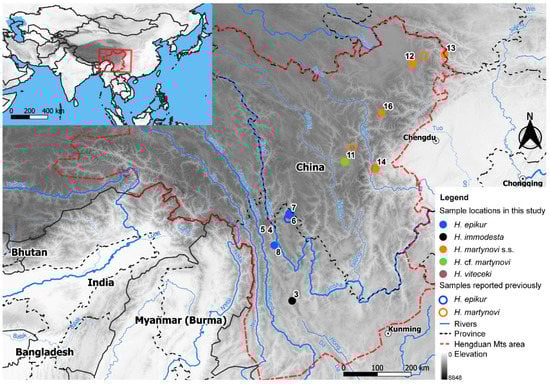 The origin and evolution of biodiversity in the region of the Qinghai–Tibet Plateau (QTP) (i.e., incl. the Hengduan Mts) is an intricate process, involving multiple local and global changes, resulting in a remarkable accumulation of species. In the literature, the diversification of most taxa is attributed to abiotic changes, either climatic or geological [10], and indeed such environmental modifications could act as dynamic drivers for the speciation process, for instance by modifying geographic barriers. As suggested in the “mountain-geobiodiversity hypothesis” [11], patterns of increased diversification in mountain areas (and specifically in the region of the QTP) are associated with three boundary conditions, including a full elevational zonation (i), a high ruggedness of the terrain providing environmental gradients (ii), as well as climate oscillations which facilitate mountain systems to act as “species-pumps”, i.e., they serve as the background for repeated pulses of elevational migration leading to fragmentation and ultimately speciation followed by species expansions over large time scales [11] (iii). Conditions (i) and (ii) were probably realized early on in the orogeny of the Hengduan Mts, as alpine vegetation evolved during the Oligocene in this region [12]. Many radiations, however strongly overlap temporally with climate oscillations (iii) of the last few million years, at least in plants [10]. During these more recent times, cyclical climatic modifications may have fostered alternate phases of species’ range fragmentation (allopatric differentiation) and secondary contact, upon which gene flow among species or populations with incomplete reproductive isolation may have occurred. Thus, the hypothesis provides a good overview on how dynamic abiotic conditions affect the evolution of mountain biota. In the Hengduan Mts, climate changes and orogenic movements profoundly changed the relative frequency and the distribution of available habitats, affecting species movement and distributions and ultimately speciation and patterns of diversity [13]. Species complexes are common in the Hengduan Mts (e.g., plant [14], mammal [15], fungus [16], caddisflies [17]) and represent good models for studying evolutionary processes and mechanisms of speciation in the context of the mountain-geobiodiversity hypothesis.