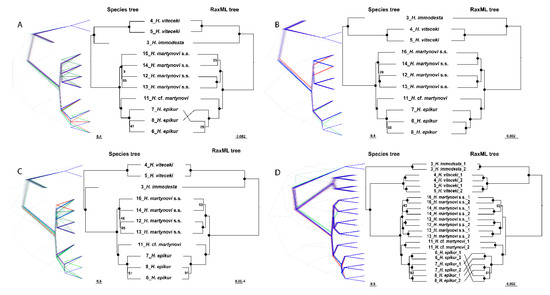Species tree with 691 loci (left) and RaxML tree with the concatenated loci (right) for Himalopsyche martynovi complex based on four datasets used in this study: (A) with allele 1; (B) with allele 2; (C) with the merged allele based on IUPAC code. On each figure, the left part shows a plot of the complete bootstrap species tree distribution using DensiTree (D). The black circle on the branch node represents bootstrap scores above 96, otherwise is shown with numbers. H. martynovi s.s. is the abbreviation of H. martynovi sensu stricto.