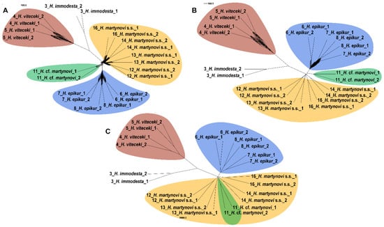 The ExDFOIL analyses revealed numerous signals of gene flow among the four taxa (excluding H. immodesta, the outgroup) (Figure 4, File S1: Table S4, File S5). For example, the analysis detected frequent bidirectional gene flow (counts = 10) between different individuals of H. epikur and one subclade of H. martynovi s.s.. Introgression is also likely to have occurred between H. martynovi s.s. and H. cf. martynovi (counts = 11). Finally, there were some unidirectional signals (counts = 2) of gene flow from one subclade of H. martynovi s.s. into H. cf. martynovi. In addition, there was one bidirectional gene flow signal between H. viteceki and H. cf. martynovi.