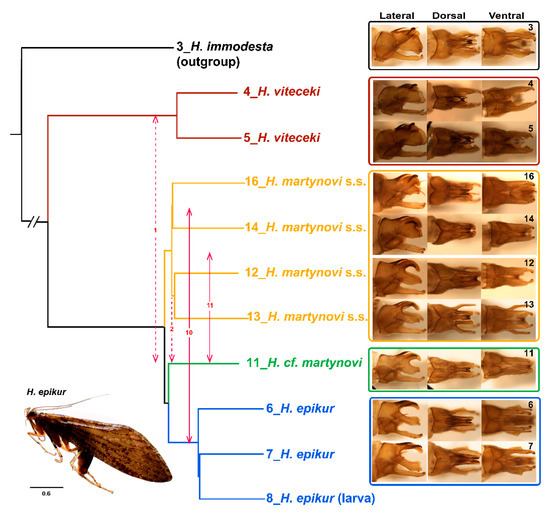 From our results it is clear that there are at least three lineages in the H. martynovi complex even though there is unusually high morphological variation among the specimens of H. martynovi s.s. Interestingly, H. cf. martynovi presents an intermediate morphology between H. martynovi s.s. and H. epikur (Figure 4). For example, the incised curving in the middle of the superior appendages of H. cf. martynovi is concave to an intermediate degree compared with specimens of H. martynovi s.s. and H. epikur. Moreover, the distal margin of the superior appendages in H. cf. martynovi shows an intermediate form between the protruding shape in H. martynovi s.s. and the concave shape in H. epikur. The concordance of the molecular and morphological evidence suggests that either a stepwise evolution of traits occurred among these three lineages, or alternatively that intermediate morphologies in H. cf. martynovi were acquired via gene exchange between or with H. martynovi s.s. and H. epikur.