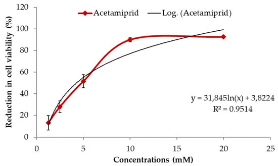 Acetamiprid (ACE), (E)-N-((6-chloropyridin-3-yl)methyl)-N’-cyano-N-methylacetimidamide, is a commonly used neonicotinoid insecticide [7]. It appears to have a very high activity against Hemiptera and Thysanoptera like other neonicotinoids; additionally, it shows a great activity against Lepidoptera [8]. It is used to control sucking insects on leafy vegetables, citrus and pome fruits, grapes, cottons and many more [9]. It was registered as formulations containing 20% water-soluble powder of ACE and commercialized under different brand names such as MOSPILAN 20, GOLDPLAN 20, HEKPLAN 20, etc., in Turkey, and different concentrations ranging from 0.06 to 0.4 g/L water were recommended for numerous insects due to their life-cycle and agriculture field [10].
