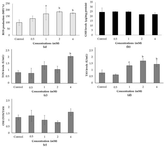 H2-DCFDA results indicated that ACE increased the ROS production in a dose-dependent manner. ROS production was significantly induced in 1, 2 and 4 mM concentrations of ACE at the rates of 69.05%, 85.31% and 74.05%, respectively, compared to the control (Figure 2a). Similarly, TOS levels increased in a dose-dependent manner; however, statistical significance was attained only at the highest concentration (p < 0.01) (Figure 2c). TAS levels also significantly increased at ≥1.2-fold in 1, 2 and 4 mM concentrations of ACE (Figure 2d). Similar to GSH levels (Figure 2b), OSI did not change at any concentrations tested (Figure 2e) despite the increases in TOS and TAS levels that were measured.