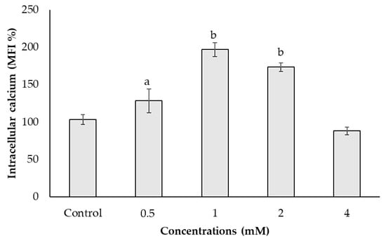 Intracellular calcium significantly increased at 0.5, 1 and 2 mM concentrations of ACE at the rates of 28.52%, 97.03% and 73.52%, respectively, compared to the control. Furthermore, calcium content decreased about 20% at 4 mM concentration compared to the control (Figure 3).