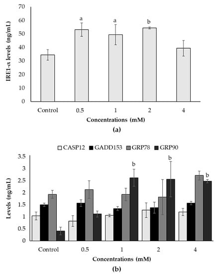 IRE1-α levels significantly increased at 0.5, 1 and 2 mM concentrations of ACE at the levels of 53.24 ng/mL, 49.43 ng/mL and 54.35 ng/mL, respectively, compared to the control (34.51 ng/mL) (Figure 4a). Additionally, GRP90 levels significantly increased at 1, 2 and 4 mM concentrations of ACE at the levels of 2.58 ng/mL, 2.52 ng/mL and 2.43 ng/mL, respectively, compared to the control (0.41 ng/mL). However, CASP12, GADD153 and GRP78 levels did not change in any concentrations tested (Figure 4b).