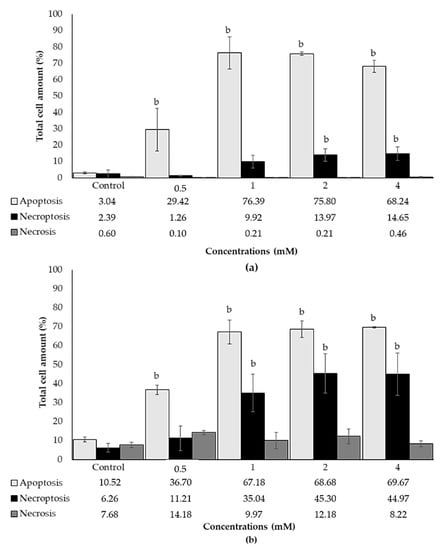 The cellular death pathway was determined by Annexin V/PI staining by a flow cytometer and fluorescent microscopic imaging. ACE significantly caused apoptotic cell death between the range of 29.42% and 76.39% in all concentrations tested. Although necroptosis was induced in a dose-dependent manner, significant changes were observed at 2 and 4 mM concentrations of ACE at the rates of 13.97% and 14.65%, respectively, whereas necrosis was not induced in any concentrations tested (Figure 5a). Additionally, semi-quantitative analysis obtained from fluorescent microscopic images showed that ACE induced apoptosis between the range of 36.70% and 69.67% in all concentrations tested. Additionally, ACE induced necroptosis between the range of 35.04% and 45.30% at higher concentrations while necrosis was not induced (Figure 5b). Even though the necroptotic and necrotic cell rates were higher in fluorescence microscopic analysis, apoptotic cell rate was similar in both flow cytometric and fluorescence microscopic analyses. The representative fluorescent microscopic images are provided in Supplementary Material (Figure S1).