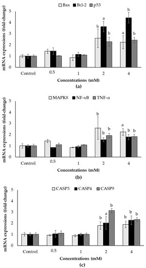 The most apparent alteration occurred in Bcl-2 with 3.63-fold and 4.42-fold upregulation at 2 and 4 mM concentrations of ACE, respectively, compared to the control (Figure 6a). Additionally, the two highest concentrations (2 and 4 mM) of ACE significantly increased the mRNA expression levels of Bax (≥2.24-fold), p53 (≥2.29-fold), MAPK8 (2.36-fold), NF-κB (≥1.56-fold), TNF-α (≥1.82-fold), CASP3 (≥1.80-fold), CASP4 (≥2.02-fold) and CASP9 (≥2.34-fold) (Figure 6a–c).