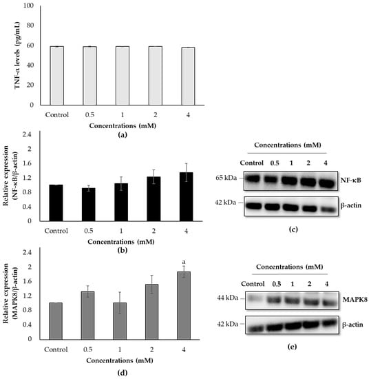 TNF-α levels were measured by an ELISA assay, and NF-κB and MAPK8 protein expressions were detected by Western blot analysis to identify the ultimate effect of ACE on the apoptosis pathway. TNF-α levels did not change in any concentrations tested (Figure 7a), and NF-κB protein expression slightly increased in 4 mM of ACE (Figure 7b,c). Although there was a dose-dependent-like increment in MAPK8 protein expressions, 2 and 4 mM of ACE increased the MAPK8 level by 1.37-fold (p = 0.084) and 1.48-fold (p = 0.023), respectively (Figure 7d,e). All Western blot images and densitometric analyses are presented in Supplementary Material (Figures S2–S4).