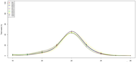 After high-throughput sequencing, a total of 12.4 Mb; 15.2 Mb; 14.2 Mb; and 13.7 Mb raw reads, and 18.3 Mb; 10.9 Mb; 14.2 Mb; 10.9 Mb; 11.5 Mb; and 10.0 Mb raw reads were obtained in the NC and HC groups, respectively. After removing the junk sequences, sequences with a length of more than 27 nt or less than 17 nt, RNA family sequences (Figure S1) and repeat sequences, 5.5 Mb; 10.1 Mb; 9.14 Mb; 6.46 Mb and 12.1 Mb; 4.33 Mb; 4.87 Mb; 6.74 Mb; 7.89 Mb; and 3.97 Mb high-quality reads, respectively, remained for further analysis (Table S2). After filtering the read length and analyzing the length distribution, it transpired that most of the reads were distributed between 20 and 23 nt, with 22 nt being the most abundant (Figure 1).