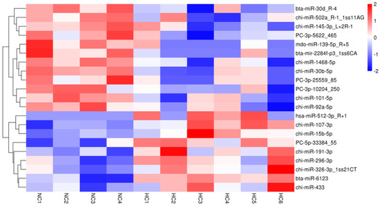 A heatmap of differentially expressed miRNAs in the NC and HC diets with a fold-change > 2.0 and p < 0.05.