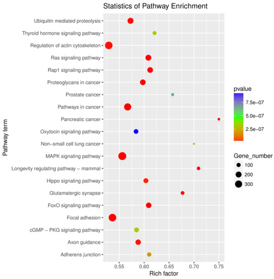 Of the 596 expressed miRNAs, twenty-one were differentially expressed, with nine upregulated and twelve downregulated. All DEmiRNAs showed a more than 2.0-fold change threshold and a p-value of less than 0.05 (Figure 2 and Table S3). To explore the function of our aberrantly expressed miRNAs, the Gene Ontology (GO) consortium and Kyoto Encyclopedia of Genes and Genomes (KEGG) pathways for annotation analysis were further performed. Based on the GO enrichment analysis (p-value of Fisher’s exact test < 0.01), these differentially expressed miRNAs were found to be involved in the regulation of transcription, the oxidation-reduction process, signal transduction, protein phosphorylation, ATP binding, metal ion binding, protein binding, zinc ion binding and poly(A) RNA binding (Figure 3). Functional pathway analysis showed that the MAPK, Ras, Rap1, FOXO signaling pathway, and focal adhesion were significantly enriched by the HC diet (Figure 4, Table S4). The interactive network of miRNAs associated with cell cycle and inflammation and the corresponding targeted genes is shown in Figure 5. It appears that miR-30d, miR-6123 and mi-15b play an important role in regulating several genes in this network.