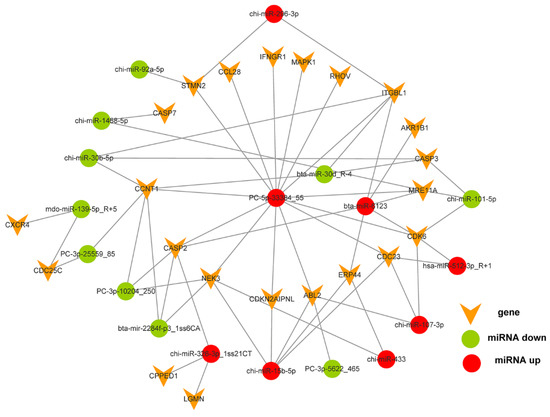 where N is the number of all genes with GO or KEGG annotation; n is the number of DEmiRNAs target genes in N; M is the number of all genes that are annotated to certain GO terms or specific pathways; and m is the number of DEmiRNAs target genes in M. GO terms or pathways meeting this condition with p < 0.05 were defined as significantly enriched GO terms or pathways in the DEmiRNAs target genes. The column chart of GO enrichment and the bubble diagram of KEGG pathway enrichment were drawn using the ggplot2 package (R package). The interactive network between differentially expressed miRNAs and their targeted mRNA, related to cell cycle and inflammation, was visualized in Cytoscape (https://cytoscape.org/release_notes_3_6_0.html#manual, version 3.6.0 accessed on 16 November 2017).