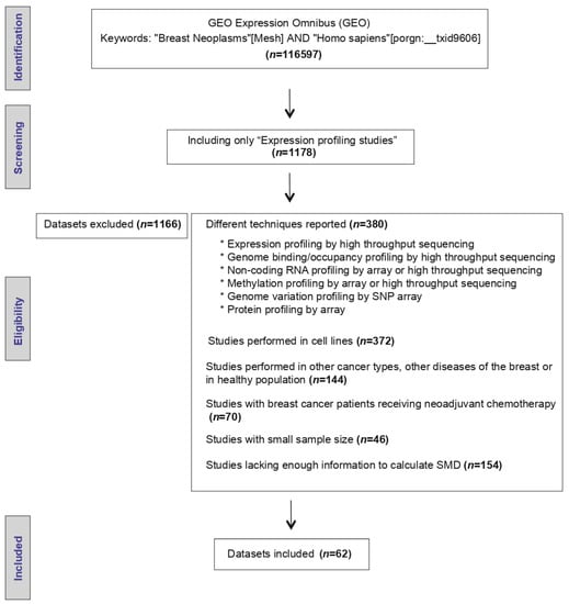 Available microarray datasets related to BC were downloaded from the GEO repository in the National Center for Biotechnology Information (NCBI) website https://www.ncbi.nlm.nih.gov/geo/ (accessed on 20 May 2020). The final date for dataset inclusion was August 2020. The search strategy included the terms (“Breast Neoplasms” [Mesh]) AND “Expression Profiling” AND (“Homo sapiens” [porgn:_txid9606]).