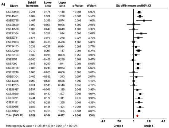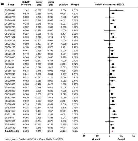 Thirty-nine microarray datasets with clinical information of BC patients regarding their histological grade were included in the meta-analysis. Interestingly, in the primary analysis, the expression of AR was significantly increased in both tissues from patients with histological grade 1 (SMD: 0.427; 95% CI: 0.223–0.630; p < 0.001) and grade 2 (SMD: 0.408; 95% CI: 0.309–0.507; p < 0.001) compared to grade 3 tissues, with considerable heterogeneity (Supplementary Figure S1A,B). After exclusion of potential outliers, the trend of the pooled effect did not change and the expression of AR was still higher in both patients with histological grade 1 and grade 2 compared to patients with grade 3 (Figure 2A,B). Herein, the heterogeneity was moderate for both analyses. In these cases, there was no evidence of publication bias, based on the funnel plots and Egger’s test (Supplementary Figures S6A,B and S7A,B). There was no statistical evidence that tumor size, regional lymph node involvement, or the presence of distant metastasis had an association with AR gene expression levels.